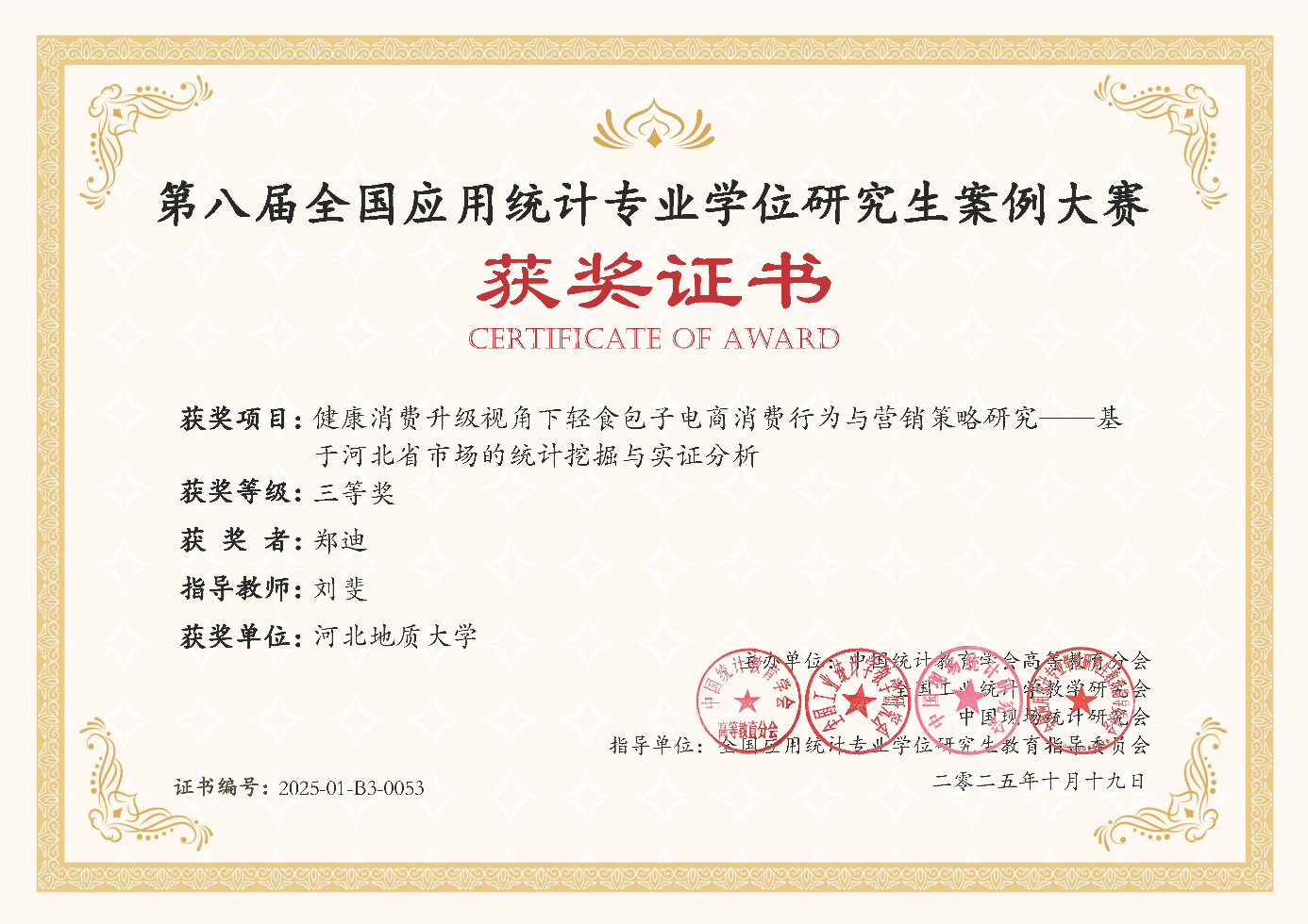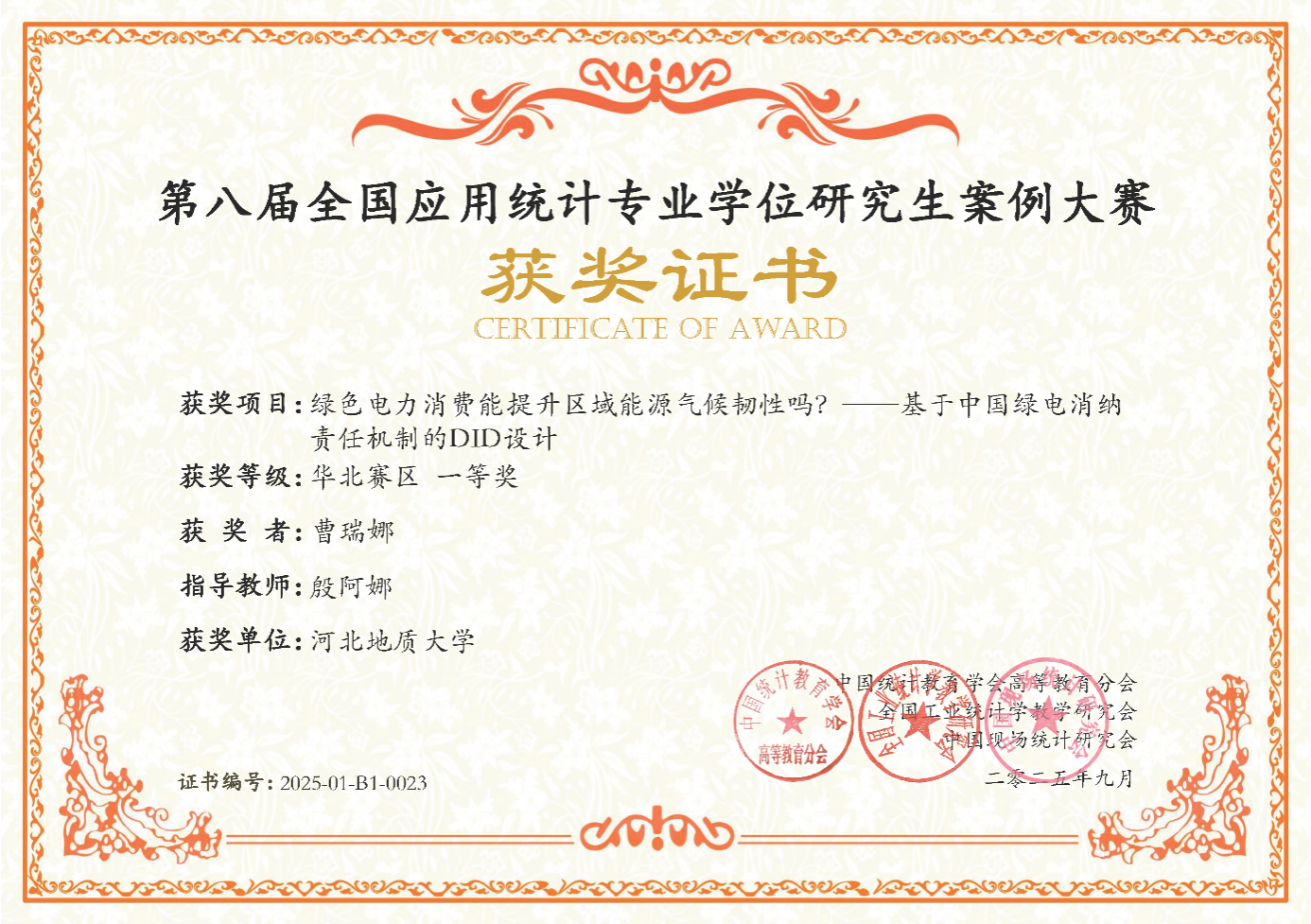 在获奖作品中,由殷阿娜老师指导、曹瑞娜同学完成的《绿色电力消费能提升区域能源气候韧性吗?——基于中国绿电消纳责任机制的DID设计》以及刘斐老师指导、郑迪同学完成的《健康消费升级视角下轻食包子电商消费行为与营销策略研究——基于河北省市场的统计挖掘与实证分析》两件作品在华北赛区中均获一等奖,并成功晋级全国总决赛。凭借扎实的理论支撑与突出的实践应用价值,最终双双斩获全国三等奖。